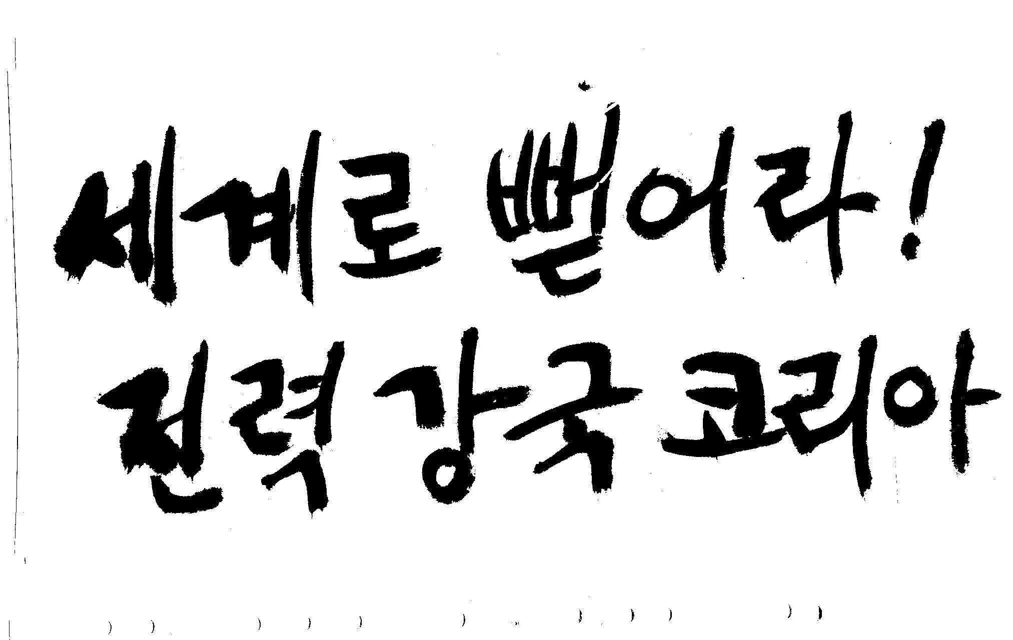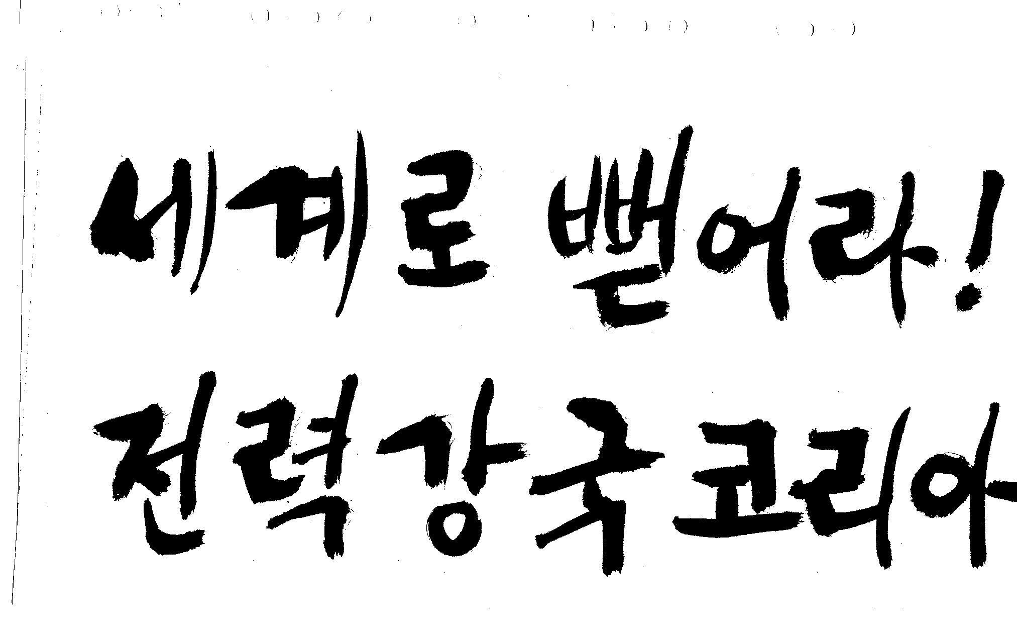 캘리 좀 부탁드려요!~ 김철호 일반 1 10639 2008.12.24 12:09 > > > > > 전력회사 신문광고를 하는데요 캘리로 멋지게 하고픈데 > > 캘리프로그램으로 아무리 써도 느낌이 안나옵니다 ㅜ.ㅜ > > 이런걸 부탁한다는 자체가 너무나도 염치없지만 부탁드립니다. > > > > 세계로 뻗어라! 전력강국 코리아 > > > 보기는 쉬워도 하기는 어려운게 > 세상 모든 일 일겁니다. > 그중에 캘리그라피가 그런것 일 겁니다... > 스캔중에 글꼴이 잘린것은 서로다른글꼴서 편집하시길... > 글수가 많아서 어쩔 수없네요... >